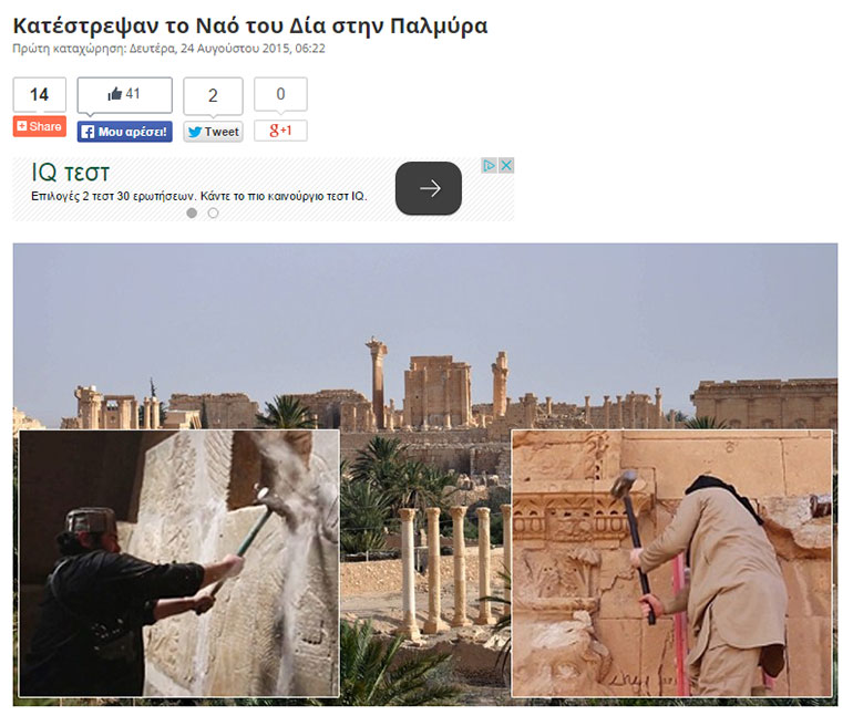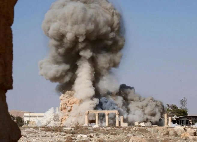 Εικόνες από τη διαδικασία καταστροφής του αρχαίου ναού Μπααλσαμίμ στην Παλμύρα της Συρίας δημοσιοποίησε το Ισλαμικό Χαλιφάτο, μέσω Διαδικτύου. Τις φωτογραφίες διέδωσαν λογαριασμοί στα μέσα κοινωνικής δικτύωσης οι οποίοι συνδέονται με τους τζιχαντιστές. Σε αυτές, εμφανίζονται μέλη της ισλαμιστικής οργάνωσης, με τα πρόσωπά τους να έχουν «προστατευθεί» με επεξεργασία της εικόνας, να «παγιδεύουν» με εκρηκτικά τον ιστορικό ναό, ο οποίος στεκόταν στη θέση του επί 2.000 χρόνια.