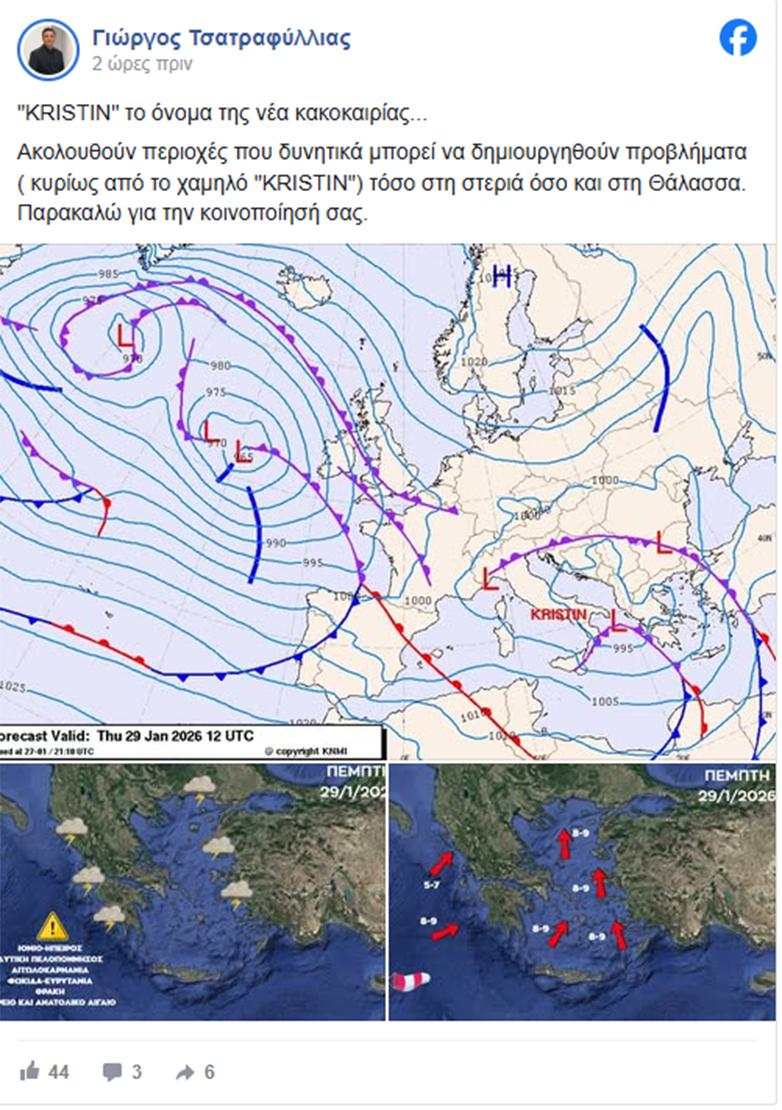 Σε νεότερη ανάρτησή του στα μέσα κοινωνικής δικτύωσης, το μεσημέρι της Τετάρτης 28/1, ο γνωστός μετεωρολόγος αναφέρθηκε στην εξέλιξη του καιρού, σημειώνοντας ότι το νέο κύμα κακοκαιρίας που αναμένεται να ξεκινήσει από τις βραδινές ώρες φέρει την ονομασία «Kristin» και συνδέεται με ισχυρό καιρικό σύστημα που αναπτύσσεται στη δυτική και κεντρική Μεσόγειο.
