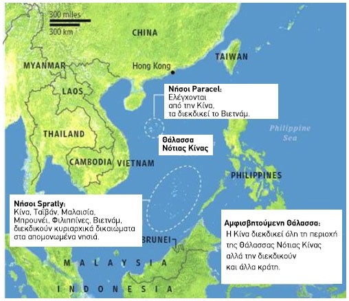 Η Κίνα διεκδικεί στο σύνολό της τη Θάλασσα της Νότιας Κίνας, την οποία διασχίζουν καθημερινά χιλιάδες εμπορικά σκάφη. Η αξία των εμπορευμάτων που περνούν από τη συγκεκριμένη θαλάσσια δίοδο αγγίζει τα 5 τρισ. δολαρίων ετησίως.