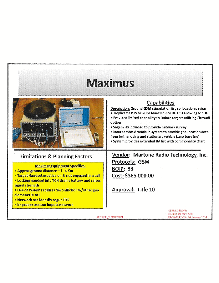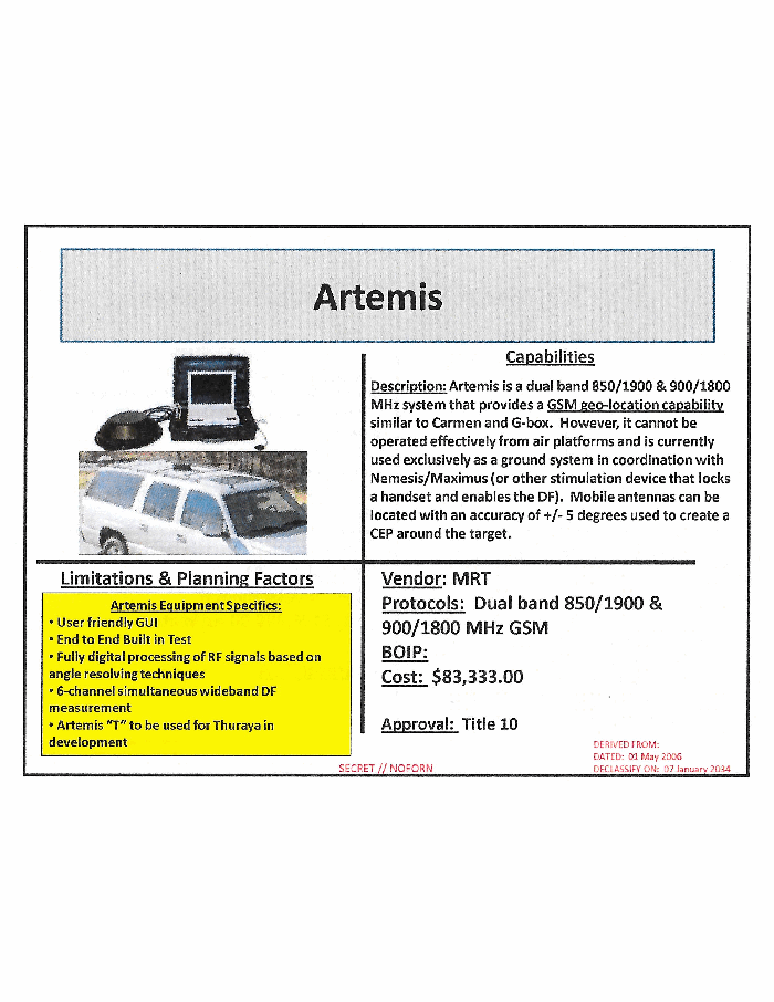 Ο κατάλογος που διέρρευσε απαριθμεί 53 συσκευές παρακολούθησης μαζί με τιμές τους, που κυμαίνονται μεταξύ 5.500 και 1.500.000 δολαρίων. Ορισμένες συσκευές δεν έχουν αναγραφόμενη τιμή, δεν δείχνουν όμως και πολύ φθηνές, αφού έχουν δημιουργηθεί ειδικά για να τοποθετηθούν σε UAVs (μη επανδρωμένα οχήματα ή drones).