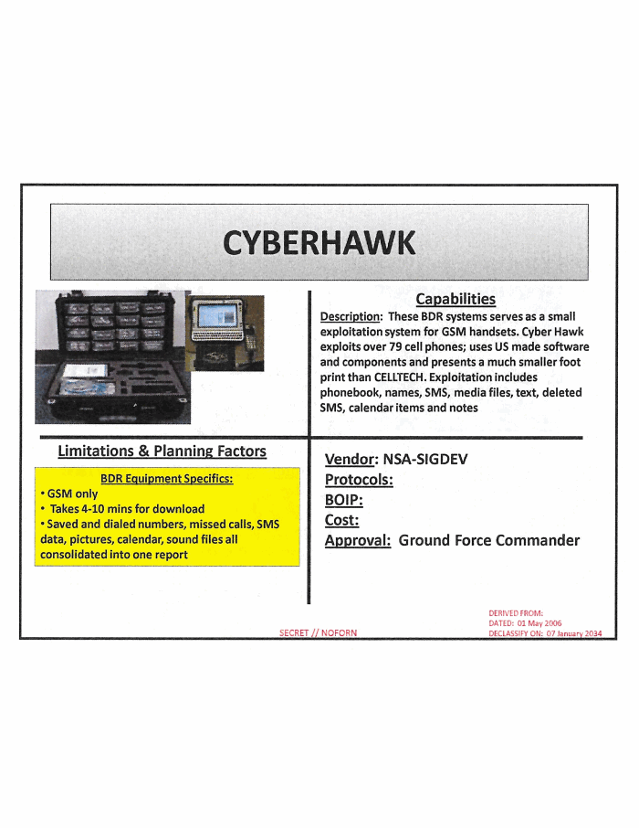 Εξαιρετικό ενδιαφέρον έχει το γεγονός πως οι περισσότερες από αυτές τις συσκευές κατασκευάζονται υπό την εποπτεία της NSA ή της CIA και έχουν κωδικά ονόματα. Μερικά από αυτά: Cyberhawk, Spartacus, Kingfish, Buckshot, Artemis, RadioEye, Typhoon, Windjammer, Nebula, Raven.