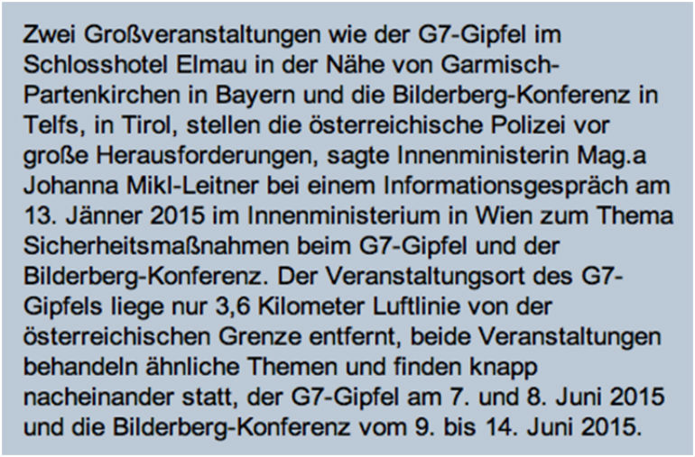 «Επιβεβαιώνουμε ότι η συνάντηση του «Bilderberg Group» θα γίνει στις 10-14 Ιουνίου 2015 στην τοποθεσία που αναφέρετε στο e-mail σας», έγραψε ο αρμόδιος για τις δημόσιες σχέσεις της αυστριακής αστυνομίας Christoph Hundertpfund, απαντώντας στον Steve Watson, συγγραφέα και ανταποκριτή στο Λονδίνο της ιστοσελίδας  του Αμερικανού δημοσιογράφου και ερευνητή  Alex Jones «Infowars.com» και «Prisonplanet.com».
