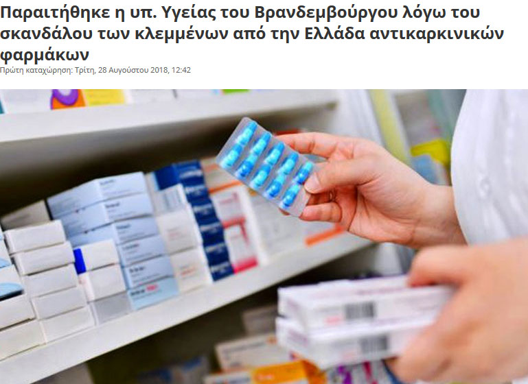 Ο YΠΟΙΚ του Βρανδεμβούργου, Ά. Γκέρμπερ, παραιτήθηκε την περασμένη εβδομάδα επικαλούμενος προσωπικούς λόγουςΗ υπόθεση όμως «πέρασε» τα ελληνικά σύνορα. Σήμερα, η Ντιάνα Γκόλτσε, του κόμματος Die Linke (Αριστερά), δήλωσε ότι δεν γνώριζε για τις κατηγορίες που έχουν διατυπωθεί σε βάρος της φαρμακευτικής εταιρείας Lunapharm, περιλαμβανομένης και εκείνης για διάθεση κλεμμένων από την Ελλάδα αντικαρκινικών.