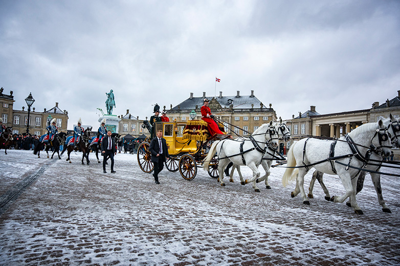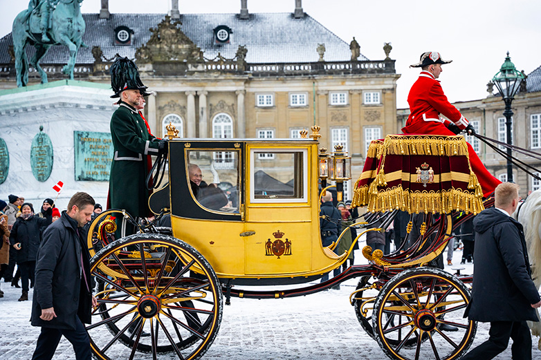 Η βασίλισσα έκανε τη διαδρομή από την κατοικία της στο Ανάκτορο Αμαλίενμποργκ, κοντά στην προκυμαία, μέχρι το κοινοβούλιο για μια παραδοσιακή πρωτοχρονιάτικη δεξίωση, επιβαίνοντας σε μια άμαξα κατασκευασμένη το 1840 για τον Χριστιανό Η’ από τον αμαξοποιό Χένρι Φάιφ και καλυμμένη με φύλλα χρυσού 24 καρατίων.