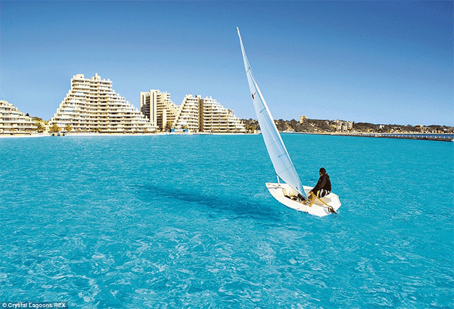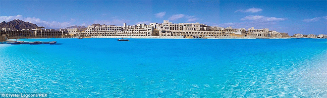 Η Crystal Lagoons δημιουργεί τεράστιες πισίνες-τεχνητές παραλίες, τις οποίες φροντίζει να περιβάλλει με χρυσαφί άμμο.