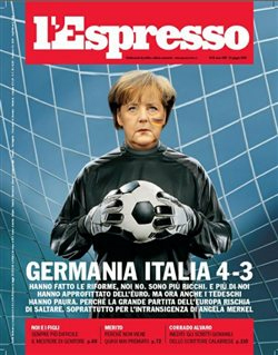 «Γερμανία Ιταλία 4-3» είναι ο τίτλος του «L’Espresso», καθώς όπως εξηγεί ο διευθυντής του, Μπρούνο Μανφελότο, κατά την παρουσίαση του εξωφύλλου της 15ης Ιουνίου «σήμερα είμαστε εμείς που υφιστάμεθα την επίθεση ή την άμυνα της Γερμανίας».