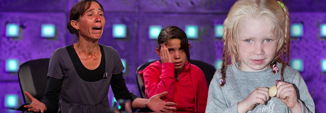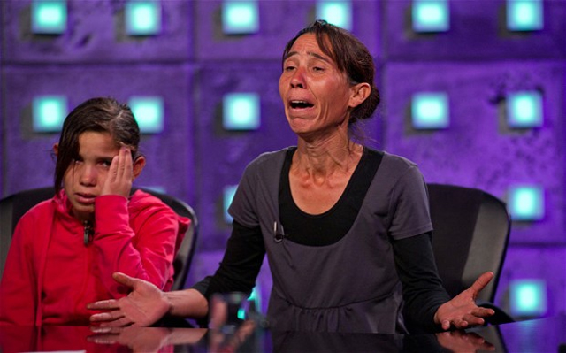 (Η Σάσα Ρούσεβα κατά τη διάρκεια της τηλεοπτικής εκπομπής. Με δάκρυα στα μάτια αρνείται κατηγορηματικά ότι πούλησε το παιδί της)