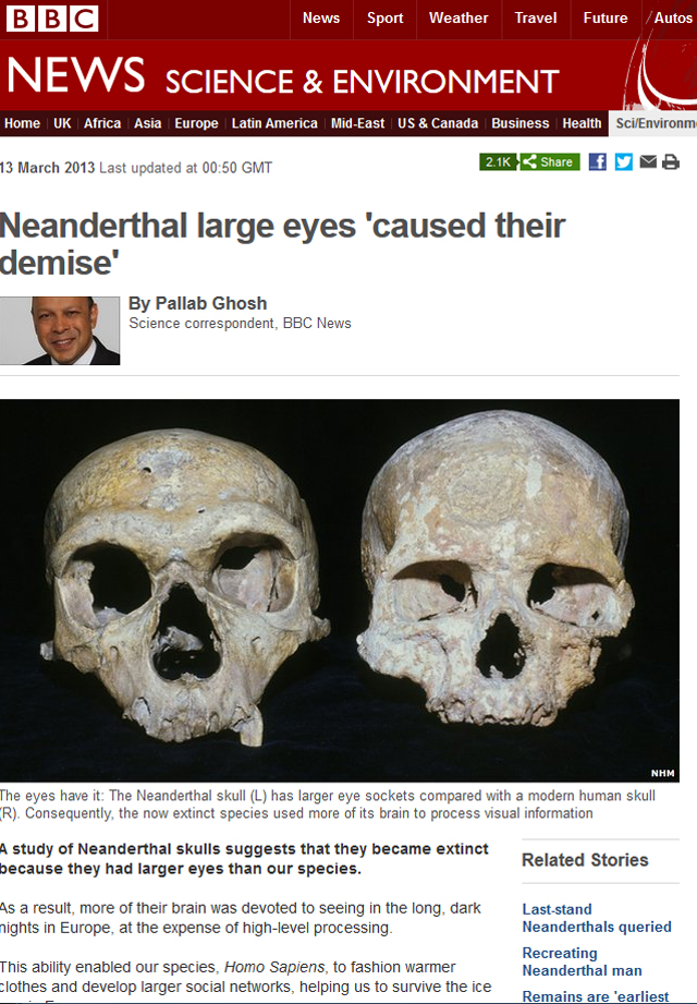 Αντίθετα, οι Νεάντερταλ έπεσαν θύματα της πολύ καλύτερης όρασής τους, που «έκλεβε» ενέργεια από το μυαλό τους! Οι Βρετανοί επιστήμονες έβγαλαν αυτά τα συμπεράσματα, αφού μελέτησαν τα κρανία 13 Νεάντερταλ και 32 ανατομικά σύγχρονων ανθρώπων. Αν και δεν έχουν διασωθεί εγκέφαλοι για να μελετηθούν άμεσα, οι ερευνητές εκτίμησαν ότι οι -κατά περίπου έξι χιλιοστά- μεγαλύτερες κοιλότητες για τα μάτια στο κρανίο των Νεάντερταλ σημαίνουν πως είχαν καλύτερο οπτικό σύστημα στον εγκέφαλό τους. Kάτι ανάλογο συμβαίνει σήμερα και με τον εγκέφαλο των πιθήκων που έχουν μεγαλύτερα μάτια.