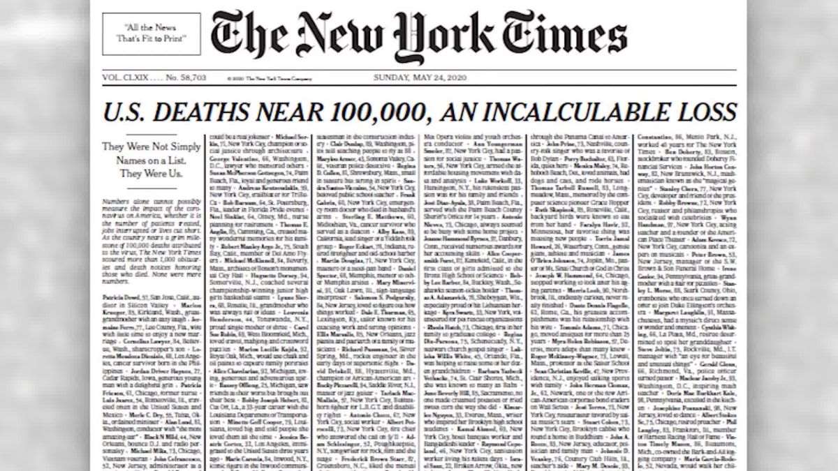 Η αμερικανική εφημερίδα New York Times, θέλοντας να σηματοδοτήσει την επικείμενη υπέρβαση του τρομερού ορίου των 100.000 νεκρών από τον κορωνοϊό στις ΗΠΑ, αφιερώνει σήμερα την πρώτη σελίδα της στη μνήμη χιλίων από τους νεκρούς αυτούς και γράφει για καθέναν τους πώς ήταν η ζωή του.