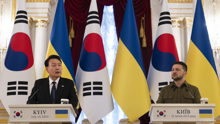 Πέρυσι η Νότια Κορέα, η ένατη χώρα σε εξαγωγές όπλων παγκοσμίως, παρείχε στην Ουκρανία ανθρωπιστική βοήθεια ύψους 100 εκατομμυρίων δολαρίων – η οποία φέτος θα αυξηθεί στα 150 εκατ. – ενώ έστειλε επίσης μη φονικά όπλα, όπως κράνη και αλεξίσφαιρα γιλέκα. Παράλληλα, πούλησε άρματα μάχης και οβιδοβόλα στην Πολωνία, έναν από τους στενότερους συμμάχους της Ουκρανίας στον πόλεμο εναντίον της Ρωσίας.