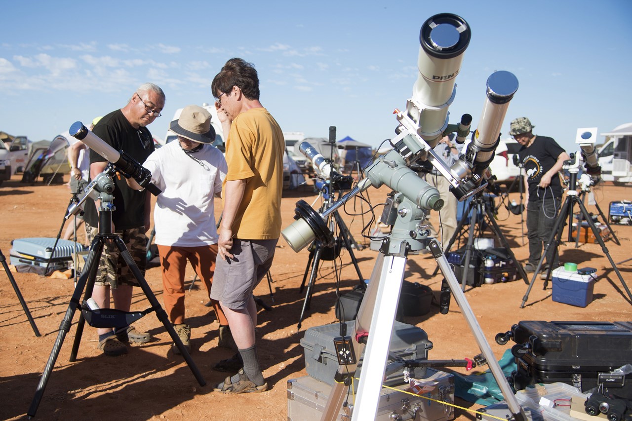 Πλήθος κόσμου είχε συγκεντρωθεί στην Exmouth κατασκηνώνοντας σε σκηνές και τροχόσπιτα σε μια κόκκινη, σκονισμένη πεδιάδα στην άκρη της πόλης με κάμερες και άλλο εξοπλισμό θέασης στραμμένο προς τον ουρανό καθώς είναι το καλύτερο μέρος στον κόσμο από όπου κανείς μπορεί να παρατηρήσει την ολική έκλειψη ηλίου σε όλο της το μεγαλείο.