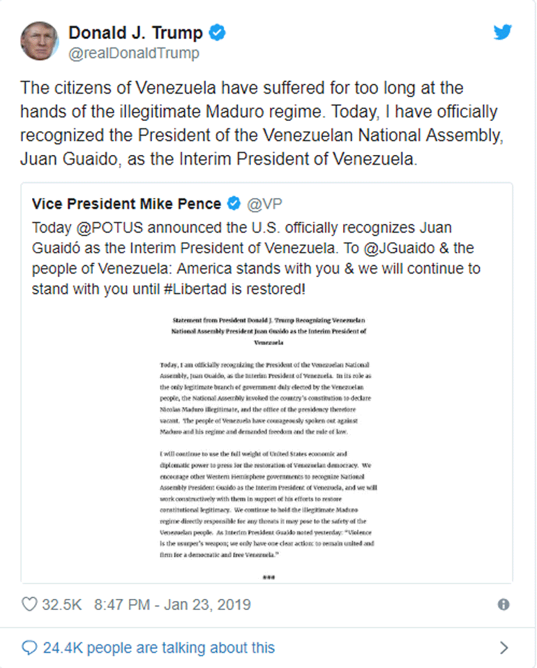 «Σήμερα, αναγνωρίζω επισήμως τον πρόεδρο της Εθνοσυνέλευσης της Βενεζουέλας Χουάν Γκουαϊντό, ως προσωρινό πρόεδρο της Βενεζουέλας», υπογραμμίζει η ανακοίνωση Τραμπ.