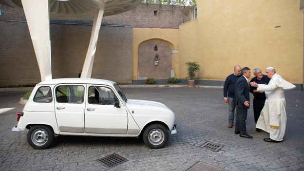 Προφανώς επηρεασμένος από τον λόγο του Πάπα Φραγκίσκου, ένας ιερέας από τη βόρεια Ιταλία του δάνεισε το προσωπικό του Renault 4L του 1984, για να κάνει μια βόλτα γύρω από το Βατικανό.