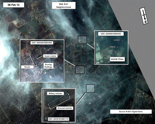 Ο Αμερικανός πρεσβευτής στη Συρία και το αμερικανικό Υπουργείο Εξωτερικών δημοσιοποίησαν την Παρασκευή στο διαδίκτυο φωτογραφίες που έχουν τραβηχτεί από δορυφόρο, τις οποίες παρουσιάζουν ως απόδειξη ότι ο συριακός στρατός διεξάγει επιχειρήσεις εναντίον αμάχων, κυρίως στη Χομς.
