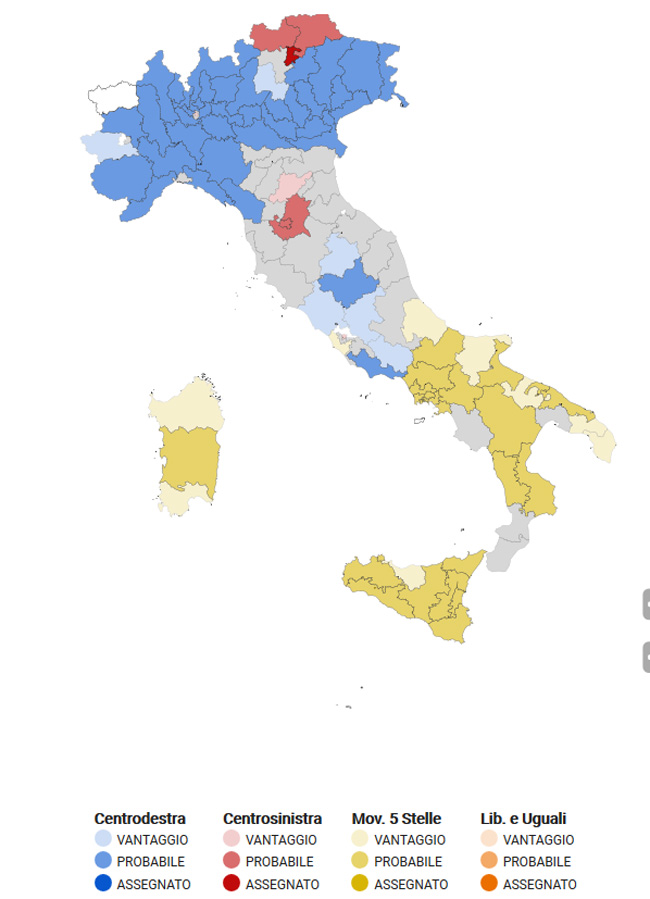 Πιο αναλυτικά, η κεντροδεξιά συμμαχία βάσει των προβολών (επί του 7% των ψήφων) λαμβάνει 36%, το Κίνημα Πέντε Αστέρων 31,8% και η Κεντροαριστερά 24,7%, ενώ το αριστερό κίνημα Ελεύθεροι και Ίσοι δεν ξεπερνά το 3,5%.
