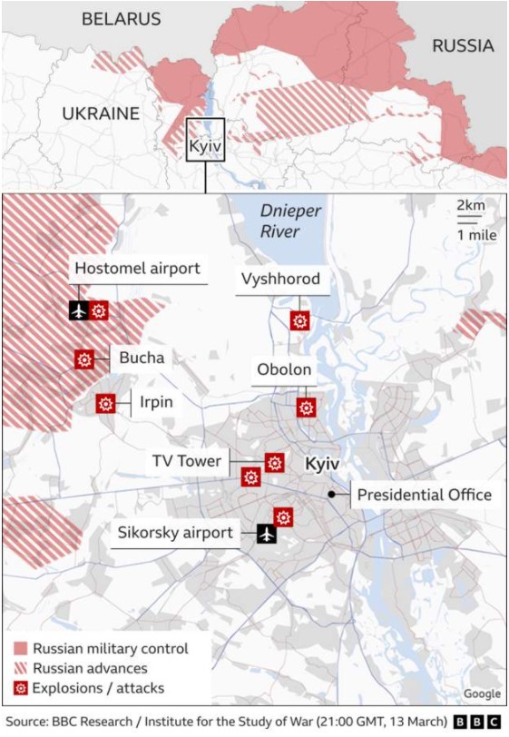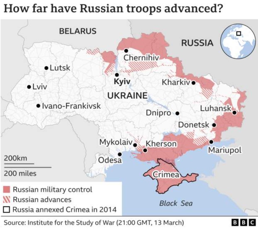 Σύμφωνα με χάρτες του Ινστιτούτου για τη Μελέτη του Πολέμου που δημοσιεύει το βρετανικό BBC αλλά και εκτιμήσεις αναλυτών της Δύσης, o ρωσικός στρατός κινείται σε σχήμα ημισελήνου, επιχειρώντας να περικλείσει την Ουκρανία από Βορρά, Ανατολή και Νότο: