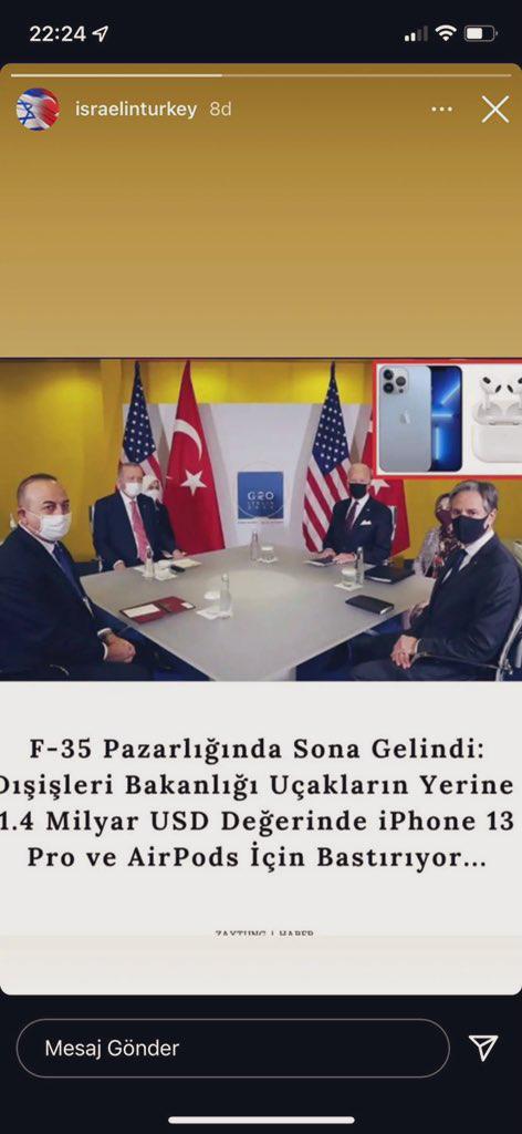 Η ανάρτηση περιλάμβανε τη φωτογραφία του Τούρκου προέδρου, Ρετζέπ Ταγίπ Ερντογάν, και του υπουργού Εξωτερικών, Μεβλούτ Τσαβούσογλου, που συναντώνται με τον Αμερικανό πρόεδρο, Τζο Μπάιντεν, και τον υπουργό Εξωτερικών των ΗΠΑ, Άντονι Μπλίνκεν, στη σύνοδο κορυφής των ηγετών της G20, που πραγματοποιήθηκε στη Ρώμη. Κάτω από τη φωτογραφία υπήρχε η λεζάντα: «Οι διαπραγματεύσεις για τα F-35 έφτασαν στο τέλος τους: το (τουρκικό) υπουργείο Εξωτερικών πιέζει για iPhone 13 Pro και AirPods αξίας 1,4 δισεκατομμυρίων δολαρίων αντί για αεροπλάνα!»