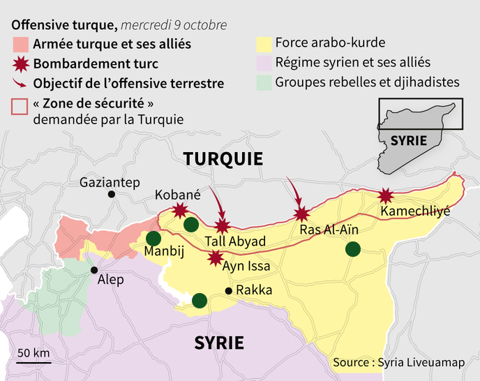 Τη Δευτέρα μονάδες του συριακού στρατού εισήλθαν στις κουρδικές πόλεις Κομπάνι, Μανμπίτζ και Ράκκα, ουσιαστικά εμποδίζοντας, προς το παρόν, την τουρκική προέλαση προς αυτές τις περιοχές. Σύμφωνα με ανεπιβεβαίωτες πληροφορίες πάντως, μονάδες του συριακού στρατού βρίσκονταν ήδη μέσα στις πόλεις αυτές, ενώ σύμφωνα με εκτιμήσεις, αν επέλθει σύγκρουση, οι Σύροι δύσκολα μπορούν να αντισταθούν στις τουρκικές δυνάμεις χωρίς την υποστήριξη των Ρώσων.