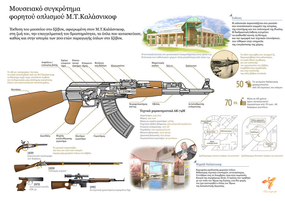 Ο Καλάσνικοφ κατασκεύασε το διάσημο όπλο του το 1947. Από τότε, έχουν κυκλοφορήσει σε όλα τα πλάτη και τα μήκη του πλανήτη περισσότερα από 70 εκατομμύρια κομμάτια όλων των τροποποιήσεων του εξαιρετικού αυτού αυτόματου τουφεκιού. Σήμερα, το AK χρησιμοποιείται από υπηρεσίες ασφαλείας και στρατούς σε περισσότερες από 100 χώρες του κόσμου και περιλαμβάνεται στον κατάλογο των σημαντικότερων εφευρέσεων του 20ου αιώνα.