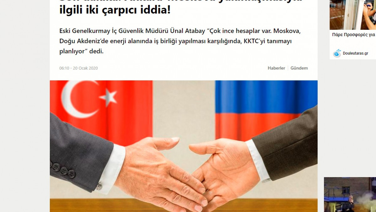 Η Ρωσία σχεδιάζει να αναγνωρίσει το ψευδοκράτος με αντάλλαγμα η Τουρκία να προσφέρει τη συνεργασία της στην ανατ. Μεσόγειο, υποστηρίζει ο πρώην διευθυντής Εσωτερικής Ασφάλειας του Γενικού Επιτελείου Στρατού της Τουρκίας, Ουνάλ Αταμπάι.