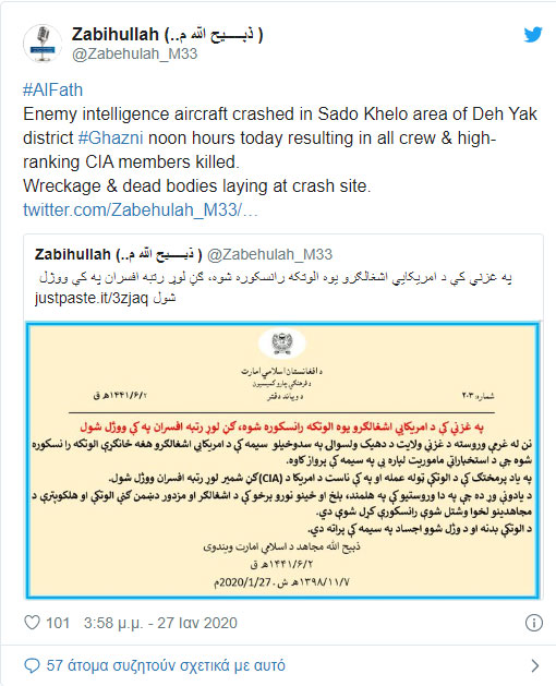 «Το αεροπλάνο πραγματοποιούσε αποστολή των υπηρεσιών πληροφοριών και καταρρίφθηκε στην περιοχή Σάντο Χελ της τοποθεσίας Ντεχ Γιακ της επαρχίας Γκάζνι».