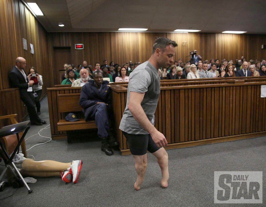 Ο Πιστόριους, που έχει υποστηρίξει ότι εκείνο το βράδυ πίστεψε ότι στο σπίτι του είχε μπει ληστής, σηκώθηκε, έβγαλε τα προσθετικά του άκρα και τρεκλίζοντας, ιδρώνοντας και με δάκρυα στα μάτια έκανε μερικούς γύρους υπό τα βλέμματα όλων των παρευρισκομένων στην ασφυκτικά γεμάτη αίθουσα του δικαστηρίου.