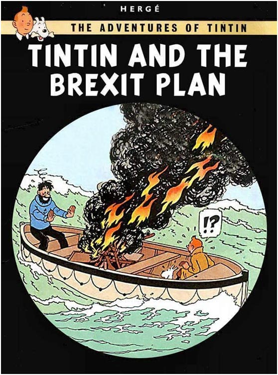 Το πόστερ που κάποιοι κρέμασαν στον τοίχο της «αίθουσας πολέμου» στις Βρυξέλλες δείχνει παρωδία εξωφύλλου περιπέτειας του Βέλγου ήρωα κόμικς με τίτλο «Τεν Τεν και το σχέδιο Brexit», όπου ο σύντροφός του κάπτεν Χάντοκ σε μια ξύλινη βάρκα έχει βάλει φωτιά για να ζεσταθούν…