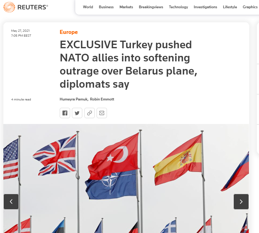 Με έντονη παρασκηνιακή δραστηριότητα η τουρκική διπλωματία τα τελευταία 24ωρα παρενέβη ενεργά στους μηχανισμούς του ΝΑΤΟ έτσι ώστε η αντίδραση της Συμμαχίας στην κρατική αεροπειρατεία που επιχείρησε το καθεστώς Λουκασένκο στη Λευκορωσία να είναι ήπια.