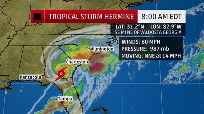 Ευτυχώς, όμως σύμφωνα με τους ειδικούς ο «Hermine» κατευθύνεται τώρα στα βορειοανατολικά «και η ταχύτερη κίνηση προς τα εμπρός θα μετριάσει κάπως τη βαριά απειλή βροχής».