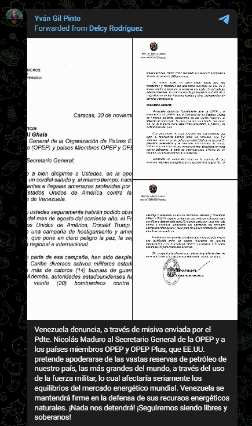 Την επιστολή του προέδρου της Βενεζουέλας Νικολάς Μαδούρο στον ΟΠΕΚ, έδωσε στη δημοσιότητα ο υπουργός Εξωτερικών της χώρας, Γιβάν Χιλ Πίντο, δημοσιέυοντας τη στο Telegram.