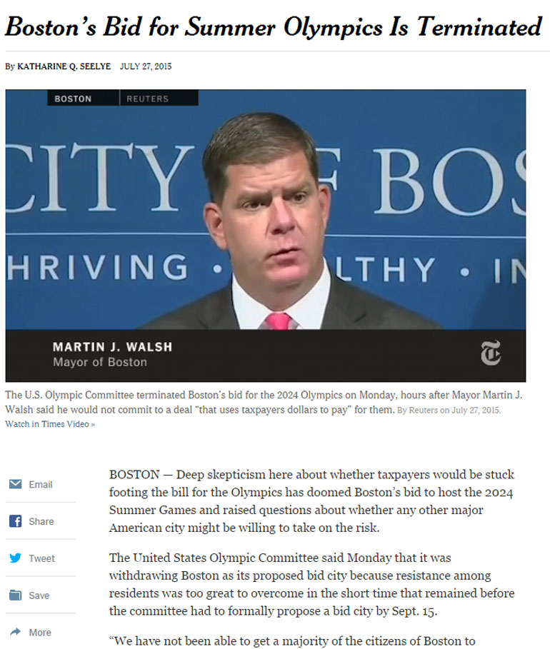 Νωρίτερα, αξιωματούχος της αμερικανικής Ολυμπιακής Επιτροπής είχε υποστηρίξει ότι η προσπάθεια διεξαγωγής των αγώνων στη Βοστόνη θα εγκαταλειφθεί λόγω της έντονης αντίθεσης της τοπικής κοινής γνώμης.