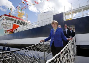 Ανάμεσα στις διαπραγματεύσεις για το ελληνικό χρέος και τις συνεδριάσεις στη γερμανική Βουλή, η Άνγκελα Μέρκελ βρήκε χρόνο και παρέστη στην τελετή ονοματοδοσίας της μηχανότρατας ROS 777 «Mark», στο Sassnitz της Γερμανίας.