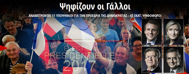 Την Παρασκευή το βράδυ, μία από τις τελευταίες δημοσκοπήσεις στην εκλογική σκηνή έφερνε τον Εμανουέλ Μακρόν, φιλελεύθερο-κεντρώο, να προηγείται με 24,5%, τη δε Μαρίν Λεπέν, ακροδεξιά και πρόεδρο του Εθνικού Μετώπου να έρχεται δεύτερη με 23% αλλά με μία δυναμική ενίσχυση του ποσοστού της που κατά τους πολιτικούς αναλυτές οφειλόταν στην τελευταία τρομοκρατική επίθεση των τζιχαντιστών στα Ηλύσια Πεδία.