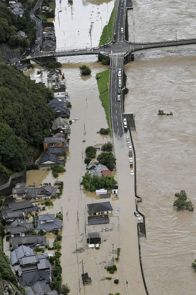 Σε τηλεοπτικά πλάνα που μεταδόθηκαν φαίνονται σπίτια και αυτοκίνητα βυθισμένα στη λάσπη στην επαρχία Κουμαμότο, όπου σύμφωνα με το NHK πλημμύρισε ο ποταμός Κούμα εγκλωβίζοντας κατοίκους στα σπίτια τους και παρασύροντας μια γέφυρα.