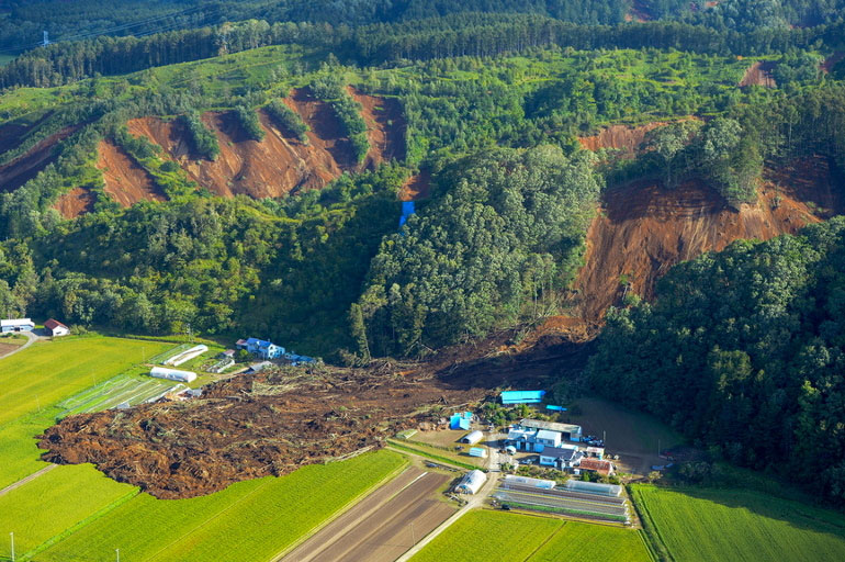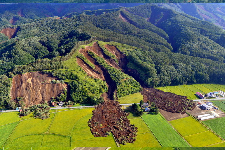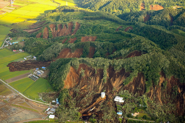 Φωτογραφίες που τραβήχτηκαν από αεροπλάνα δείχνουν τα βουνά να έχουν κοπεί κυριολεκτικά στα δύο από τις τεράστιες κατολισθήσεις που ξερίζωσαν όλα τα δέντρα και έθαψαν τα σπίτια που ήταν χτισμένα στους πρόποδες. Μπουλντόζες και γερανοί προσπαθούν να απομακρύνουν τα δέντρα ώστε να περάσουν οι άνδρες των σωστικών συνεργείων.