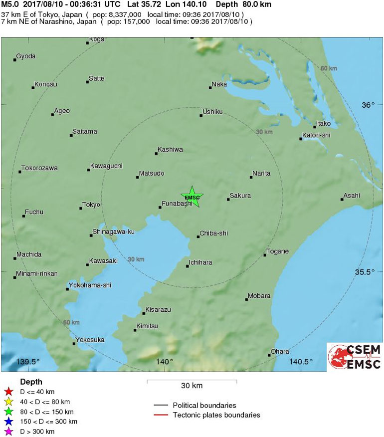 Ο σεισμός είχε επίκεντρο στη βορειοδυτική περιφέρεια Τσίμπα, ανατολικά του Τόκιο, σύμφωνα με την υπηρεσία.