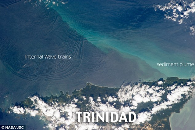 Εντυπωσιακές φωτογραφίες που ελήφθησαν από τον Διεθνή Διαστημικό Σταθμό απεικονίζουν το σπάνιο φαινόμενο των «εσωτερικών κυμάτων»- δηλαδή κολοσσιαίων κινήσεων του νερού που εκτείνονται σε χιλιόμετρα και δημιουργούν κύματα κάτω από την επιφάνεια των ωκεανών της Γης.