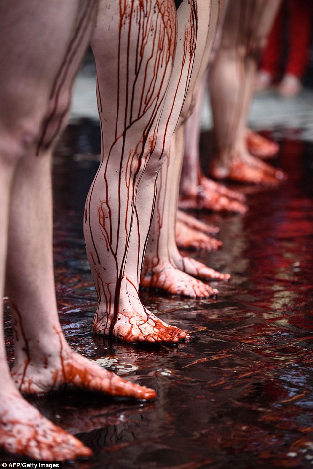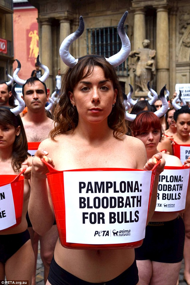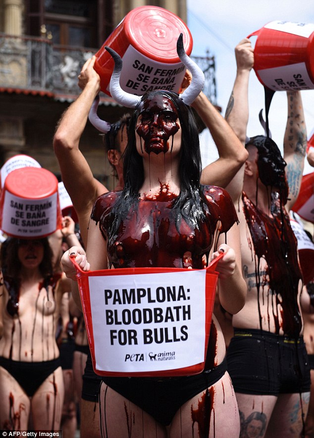 Γυναίκες και άνδρες, καλυμμένοι με κόκκινη μπογιά και ορισμένοι φορώντας κέρατα ταύρου, βγήκαν στους δρόμους της ισπανικής πόλης, για να ευαισθητοποιήσουν τον κόσμο υπέρ της κατάργησης του φεστιβάλ, το οποίο πολλοί χαρακτηρίζουν «βάρβαρο».