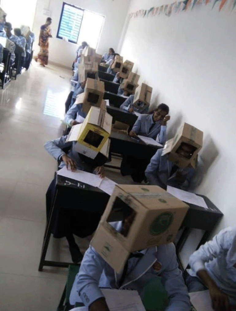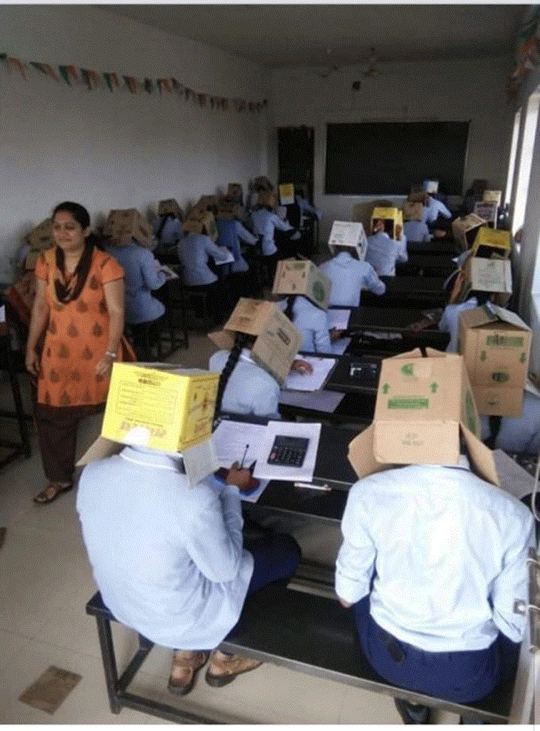 Students “thinking inside” the box. Ashamed that a college in #Karnataka #India have compelled students to wear cardboard boxes to prevent cheating. Where are we heading to with education, especially with such practices on assessments in today’s 21st century age. #Education pic.twitter.com/dC7Bt0SJMI