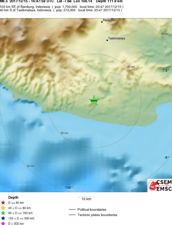 Σεισμική δόνηση μεγέθους 6,5 βαθμών της κλίμακας Ρίχτερ σημειώθηκε στις 18:47 ώρα Ελλάδος (γύρω στα μεσάνυχτα τοπική ώρα) στη νήσο Ιάβα στην Ινδονησία, σύμφωνα με το Ευρωμεσογειακό Σεισμολογικό Ινστιτούτο.