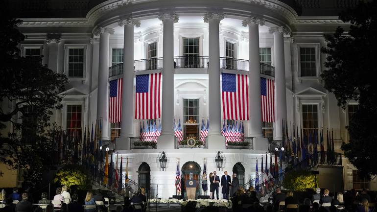 Η εκδήλωση, που οργανώθηκε σε ώρα υψηλής τηλεθέασης στο γρασίδι έξω από το κτήριο της προεδρίας, έμοιαζε σαν αντικατοπτρισμός εκείνης πριν από έναν μήνα, όταν ο Τραμπ ανακοίνωνε την υποψηφιότητά της, λίγα εικοσιτετράωρα προτού ο Λευκός Οίκος μετατραπεί σε εστία του κορωνοϊού — με τον μεγιστάνα να ανακοινώνει πως μολύνθηκε και ο ίδιος.
