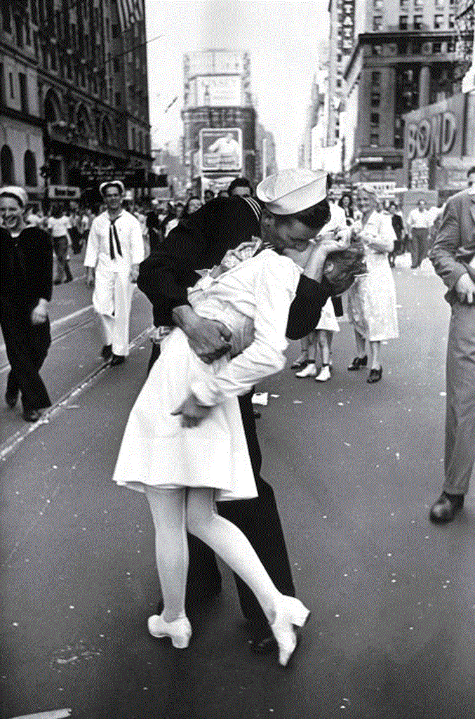 Η Γκρέτα Ζίμερ Φρίντμαν, που τότε ήταν 21 ετών και εργαζόταν ως βοηθός οδοντιάτρου, εικονίζεται στη φωτογραφία στην αγκαλιά ενός ναύτη του πολεμικού ναυτικού των ΗΠΑ, που, τρελός από χαρά, την φιλά με πάθος στο στόμα, μέσα στη μέση του δρόμου.