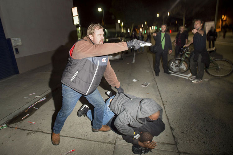 Σύμφωνα με τον Avery Browne, εκπρόσωπο της αστυνομίας του Όκλαντ, οι δύο επιθεωρητές βρισκόντουσαν εκεί για να συλλέξουν πληροφορίες και τίποτα περισσότερο. Όταν λοιπόν περικυκλώθηκαν από πενήντα περίπου διαδηλωτές, έβγαλαν από τα μπουφάν τους γκλομπ για να απωθήσουν τον κόσμο και σαν τελευταίο μέτρο προστασίας, ένας εκ των δύο, έβγαλε περίστροφο και το έστρεψε προς τους διαδηλωτές.