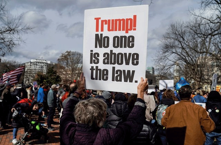 Οι διαδηλωτές συγκεντρώθηκαν κοντά στον Λευκό Οίκο κρατώντας πλακάτ με συνθήματα όπως «Ο Τραμπ εξευτελίζει το Σύνταγμα» και «Δεν θέλουμε άλλον βασιλιά».