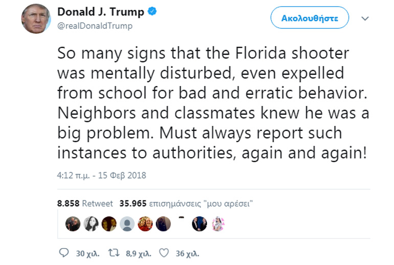 «Τόσες ήταν οι ενδείξεις ότι ο δράστης της επίθεσης στη Φλόριντα ήταν ψυχικά διαταραγμένος, ώστε είχε αποβληθεί από το σχολείο για την κακή και ασταθή συμπεριφορά του. Οι γείτονές του και οι συμμαθητές του γνώριζαν ότι αντιπροσωπεύει ένα σοβαρό πρόβλημα. Να ενημερώνετε πάντα τις αρχές, ξανά και ξανά!», έγραψε ο πρόεδρος των ΗΠΑ στο Twitter.