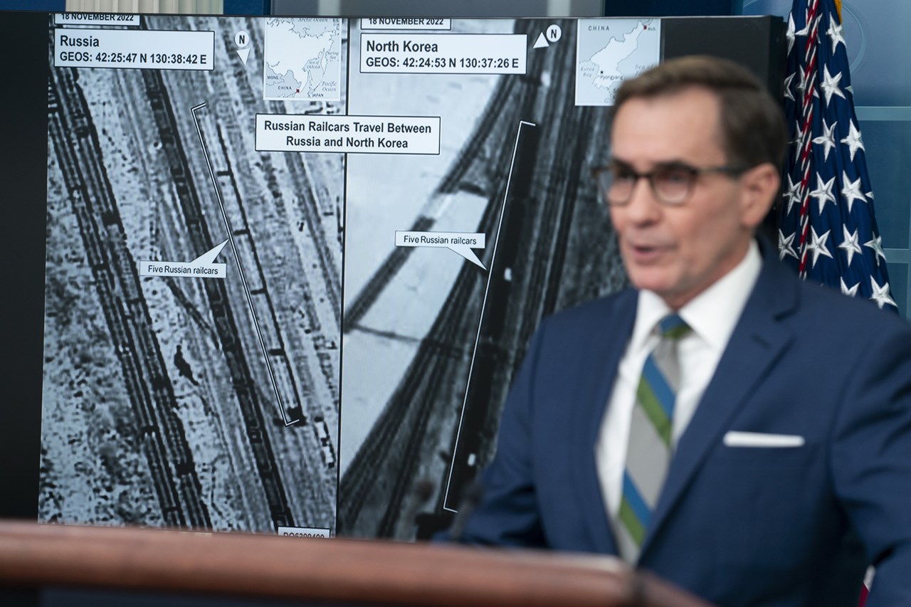 Ο Κίρμπι στη συνέχεια παρουσίασε μια δορυφορική φωτογραφία, όπου φαίνεται ένα ρωσικό τρένο να πηγαίνει στη Βόρεια Κορέα για να παραλάβει όπλα για τη Βάγκνερ. Στις 19 Νοεμβρίου η Βόρεια Κορέα γέμισε πέντε βαγόνια με εμπορευματοκιβώτια και το τρένο επέστρεψε στη Ρωσία. «Μολονότι εκτιμούμε πως η ποσότητα του υλικού που παραδόθηκε στη Βάγκνερ δεν άλλαξε τη δυναμική του πεδίου της μάχης στην Ουκρανία, αναμένουμε ότι θα συνεχίσει να λαμβάνει βορειοκορεατικά οπλικά συστήματα», πρόσθεσε.