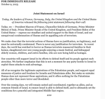 «Καλούμε άλλες εξτρεμιστικές οργανώσεις, ή οποιοδήποτε κράτος το οποίο μπορεί να επιδιώξει να επωφεληθεί από την κατάσταση, ιδιαίτερα το Ιράν, να μην προσπαθήσουν να εκμεταλλευτούν αυτή την κατάσταση για άλλους σκοπούς, να μην επεκτείνουν τη σύρραξη πέραν της Γάζας», αναφέρει κοινή ανακοίνωση των πέντε δυτικών ηγετών που δόθηκε στη δημοσιότητα από τις υπηρεσίες της γαλλικής προεδρίας.