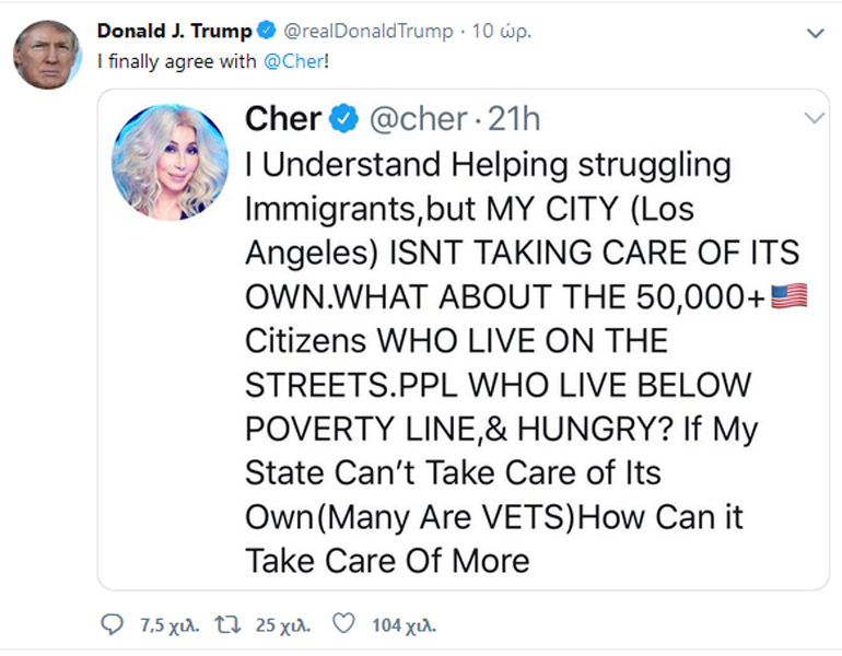 «Τελικά συμφώνησα με τη @Cher!» έγραψε ο δισεκατομμυριούχος στο Twitter, αναφερόμενος σε ένα μήνυμα που ανήρτησε μία ημέρα πριν η 72χρονη τραγουδίστρια σχετικά με την κατάσταση που επικρατεί στο Λος Άντζελες με τους αστέγους και την αδυναμία της πόλης της Καλιφόρνιας να υποδεχθεί νέους μετανάστες.