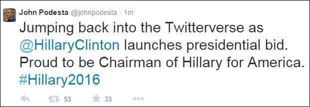 Στη συνέχεια τον γύρο του Twitter έκανε ένα tweet του Τζον Ποντέστα, σύμφωνα με το οποίο η Χίλαρι Κλίντον είναι επισήμως υποψήφια και θα αρχίσει την προεκλογική της εκστρατεία από την Αϊόβα.