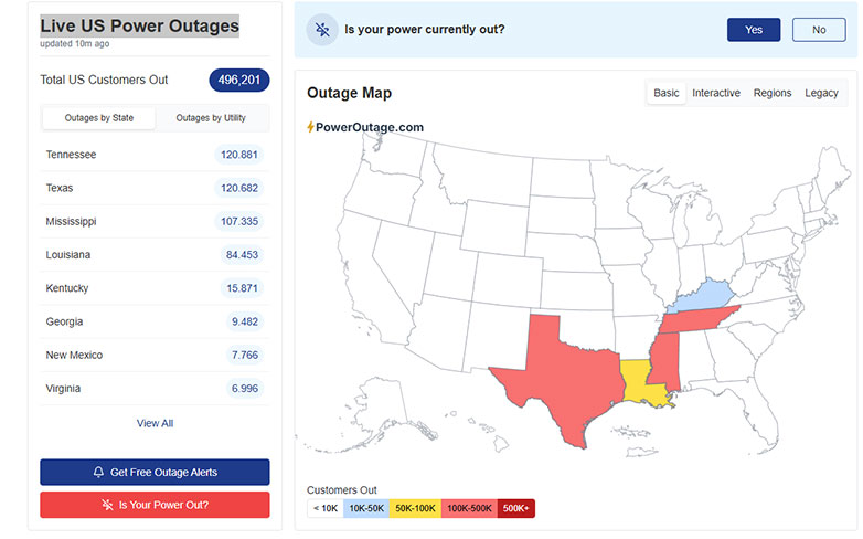 Περισσότερα από 496.000 νοικοκυριά είναι χωρίς ηλεκτρικό ρεύμα, σύμφωνα με τον ιστότοπο poweroutage.us που καταγράφει τις διακοπές
